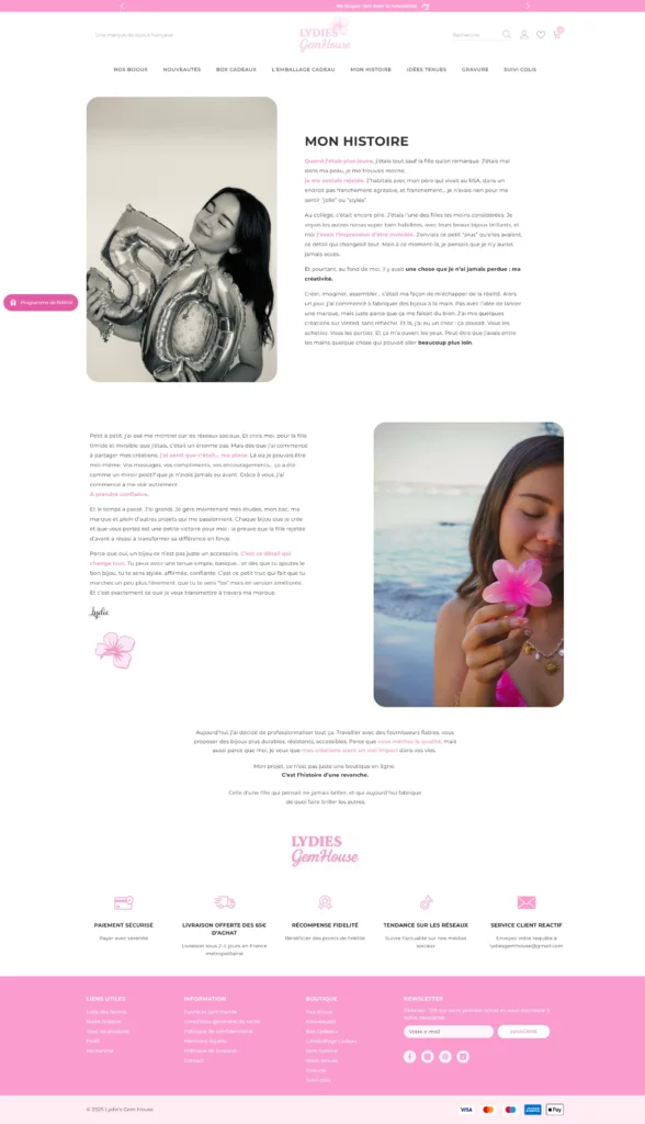 Site web e-commerce mis en place de A à Z esthétique tout en respectant les maquettes, adaptée mobile avec des fonctionnalités expérience utilisateur telles que le programme de fidélité, suivi commande, facture. Cliente satisfaite ✅